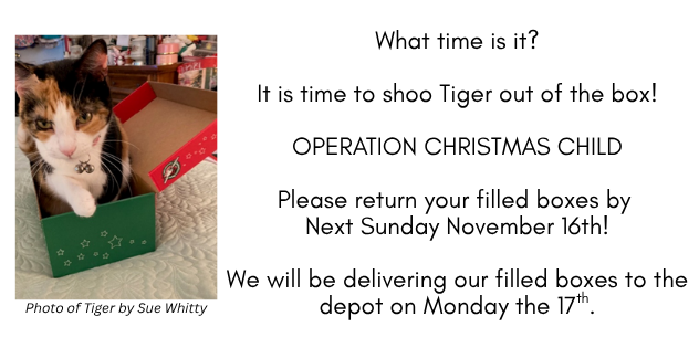 Dear UMC in Wayne, This is our* last call* for the Operation Christmas Child Boxes! We will be bringing them to the collection depot on