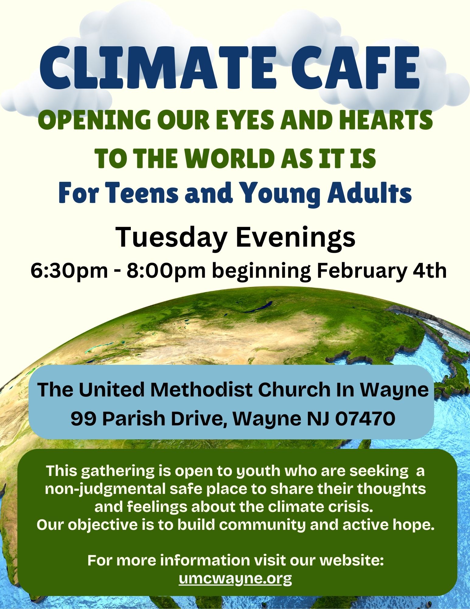 Beginning February 4, 2025, we will gather on Tuesday Evenings from 6:30pm – 8:00pm at the United Methodist Church in Wayne, 99 Parish Drive, Wayne, NJ 07470. Please use the accessible entrance closest to LeGrande Terr. Light refreshments will be provided. Our conversation facilitator is Pastor Ninabeth Metcalf. We will always have two adults accompanying us. Their role is to listen and build trust.